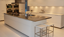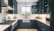 From my perspective, Contemporary is a softer, less rigid modern and I have combined these styles into one category. With this style, we always have flat panel doors, often thicker, built-up or very slim counters, the backsplash is usually a continuous and sleek material, and the color palette is simple and minimal. With this style every accent object and should be carefully selected since it will be highlighted against the elegant, uncomplicated background.