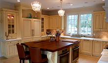 Traditional design has its roots in the 18th century English and French countryside. There tends to be more decorative details in the treatment of wood carving, turnings, and crown moldings. We may use foot details at the bases of cabinets, and corbels or brackets at the wall cabinets. There can be an eclectic mix of many different textures and styles and this is totally acceptable and fun; there are few “rules” with this style.