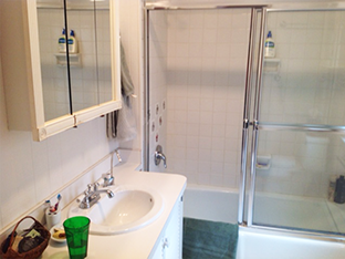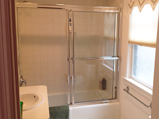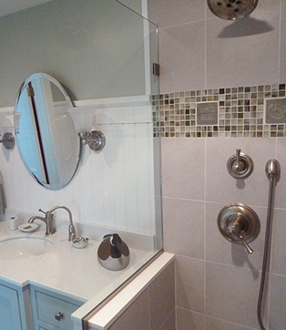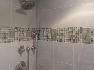 Nestled in the trees and on a lake in Northern Westchester, this was a wonderful project to work on. We used colors and images that are found on the lake: pale greens, greys, watery-blues, earth tones and water birds. We had custom tiles made for the shower area and used pebbles at the shower floor to represent the stones down by the water’s edge.