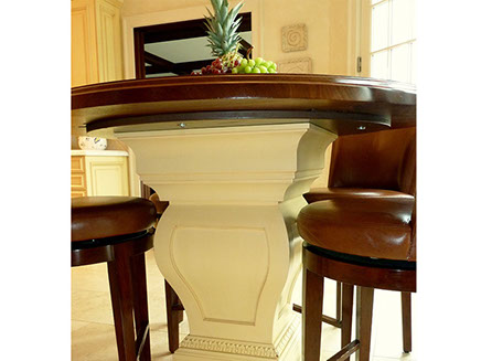 What a fun departure from the more-typical, white-painted kitchen. This is a truly beautiful space to be in with all sorts of decorative cabinet details, a custom limestone hood, custom Italian mosaic backsplash insert, gorgeous lighting, cherry wood tops at the island & the breakfast table, a 4-foot long prep sink, and an abundance of hard-working appliances.
