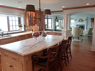 a combination of stained and white painted cabinetry, and glass backsplash tile that looks like the ever-changing grey-blue water off the Long Island Sound. The views from every room captivate and promote relaxation, and the owners have exceptional taste and furnishings. Though the home’s interior appears fairly formal, the clients