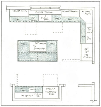 Clean, white cabinetry with black granite perimeter tops and a Calcatta Gold Marble top in the island. Double-stacked cabinetry with glass and lighting, plus pretty pendant lights dress up the space. A peg-board drawer storage system for extra dishes allowed there to be adequate storage without having to used closed wall cabinets everywhere. The flow is open for a busy mom who loves to cook and bake.