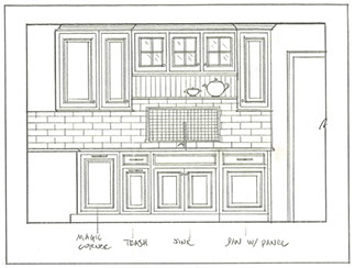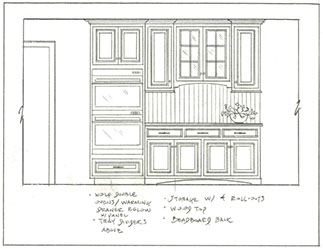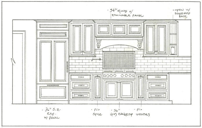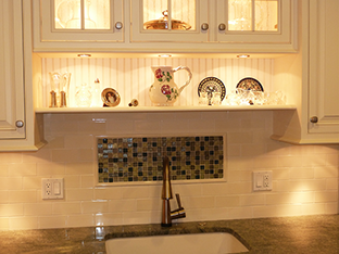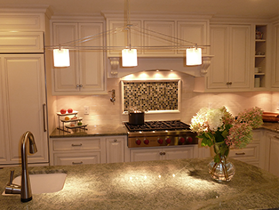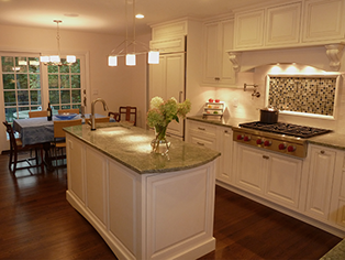 So many lovely details in this painted-white kitchen. The client had a wonderful time choosing a la carte decorative details such as a wood hood with corbels, bead-board backing in the wall cabinets, repeating glass & mullions in select areas, and open cabinetry for display. They chose updated lighting and a glass backsplash – a breakaway