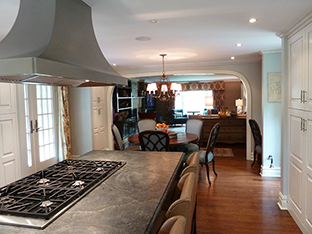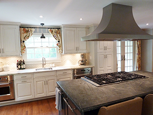 Three different finishes of cabinetry, soapstone counters at the island, marble at the perimeter counters, and handmade ceramic tiles at the backsplash. Distinct prep & clean-up areas make this elegant country kitchen a wonderful center of the home where multiple cooks can create without interfering with one another.