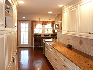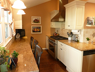 and narrow, without enough of a return at one end provided a design puzzle. We were able to gain a much-needed additional 5-1/2 feet by taking over an exterior shed, which also allowed us to vent out the powerful hood over the professional stove.