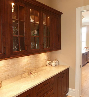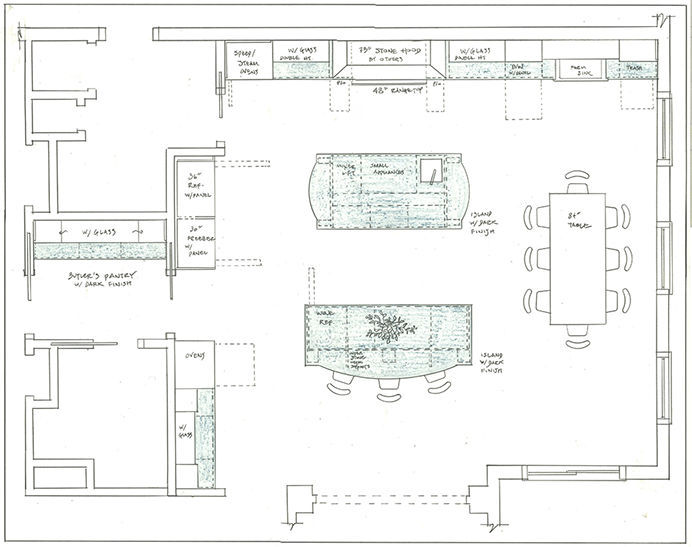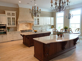 of the 1800’s. There is a lot of detail with the two cabinet finishes, two islands, corbels, valances, different heights of wall cabinetry, glass inserts and the large limestone hood. Though it has a fancy appearance, this is one hard-working kitchen for