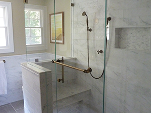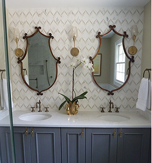 What a very special bath for two athletic teenaged kids. We had a lot of fun choosing the mirrors, spectacular cut-stone tile at the sink wall & even had a custom painted “pee-chart” made for over the toilet as a reference to the athlete’s necessity to keep hydrated.