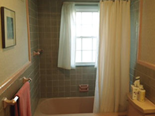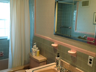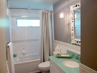 How did pink ever become a color for bathroom fixtures? This guest bath was in great need of a makeover. The client wanted to use a box of glass decorative tile left over from a previous project, so we pulled it all together by using a green glass countertop at the vanity and accenting her deco tile with green liner tiles and crisp white & grey ceramic field tile.