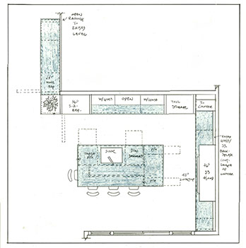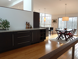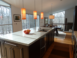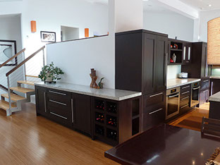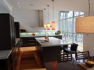 Dark-stained mahogany cabinetry, built-up thicknesses of gentle-colored granite countertops, a stunning 6-foot wide stainless steel hood, and continuous steel and glass paneled backsplash all work together as a carefully-chosen collection of beautiful components.