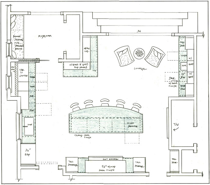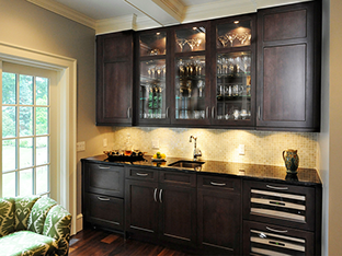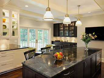 The cabinetry is both white painted and dark-stained cherry in a Merlot stain that has a hint of red. There are distinct, separate zones for cooking, hanging-out at the bar, prep-work, and clean-up.