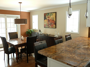 We used two colors of accent walls, deep-bronze handmade backsplash tiles and Vermont-made bronze lighting to accentuate the rich earthiness