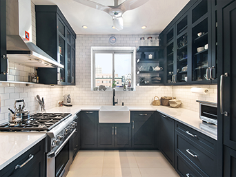 used rich charcoal-colored custom cabinetry, crisp white large-format white tiles on the floor,